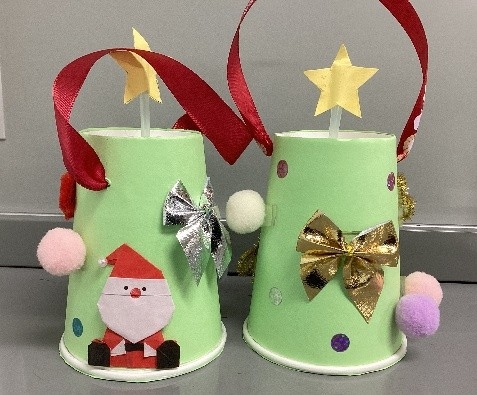 12月19日に岐阜市民病院の小児科病棟で開催されたクリスマス会に1、 2年生が参加しました。入院中の患児と保護者に少しでも安らぎの時間を過ごしていただこうと、毎年ボランティアとして参加しています。1年生はハンドベルの演奏を、2年生は患児と一緒に紙コップを使ったクリスマスツリーの工作を行いました。参加した患児や保護者の方は、演奏に合わせ歌詞カードを見ながら一緒に歌ってくれました。クリスマスツリーの工作では、それぞれ好きなデコレーションをしていました。とても楽しそうで、笑顔もたくさん見られました。