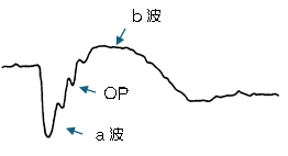 光刺激に対する眼の応答(元気具合)を波形として捉える検査です。(心臓の元気具合を心電図で調べるのに似ています。)糖尿病網膜症、網膜色素変性などの疾患における網膜の機能障害レベルを診断します。以前は検査用コンタクトレンズを眼に挿入して検査を行っていましたが、現在はまぶたに電極を貼る方法で簡便に測定できます。