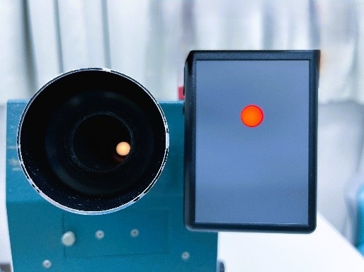 光が点滅する速度をゆっくりから早くへ、反対に早くからゆっくりへと徐々に変えていき、認識できる光のちらつき度合いを測定することで、視神経の健康状態を調べる器械です。
